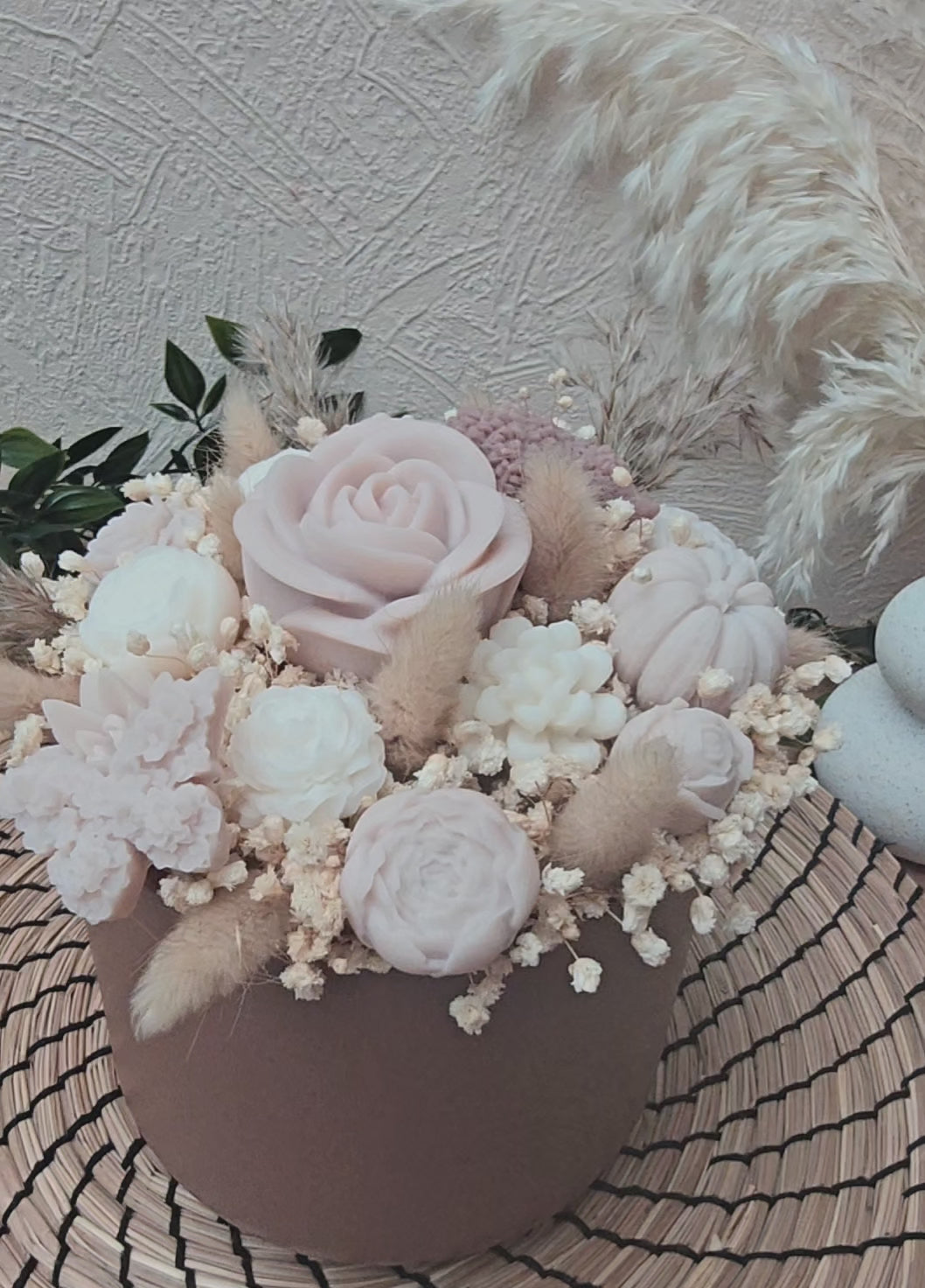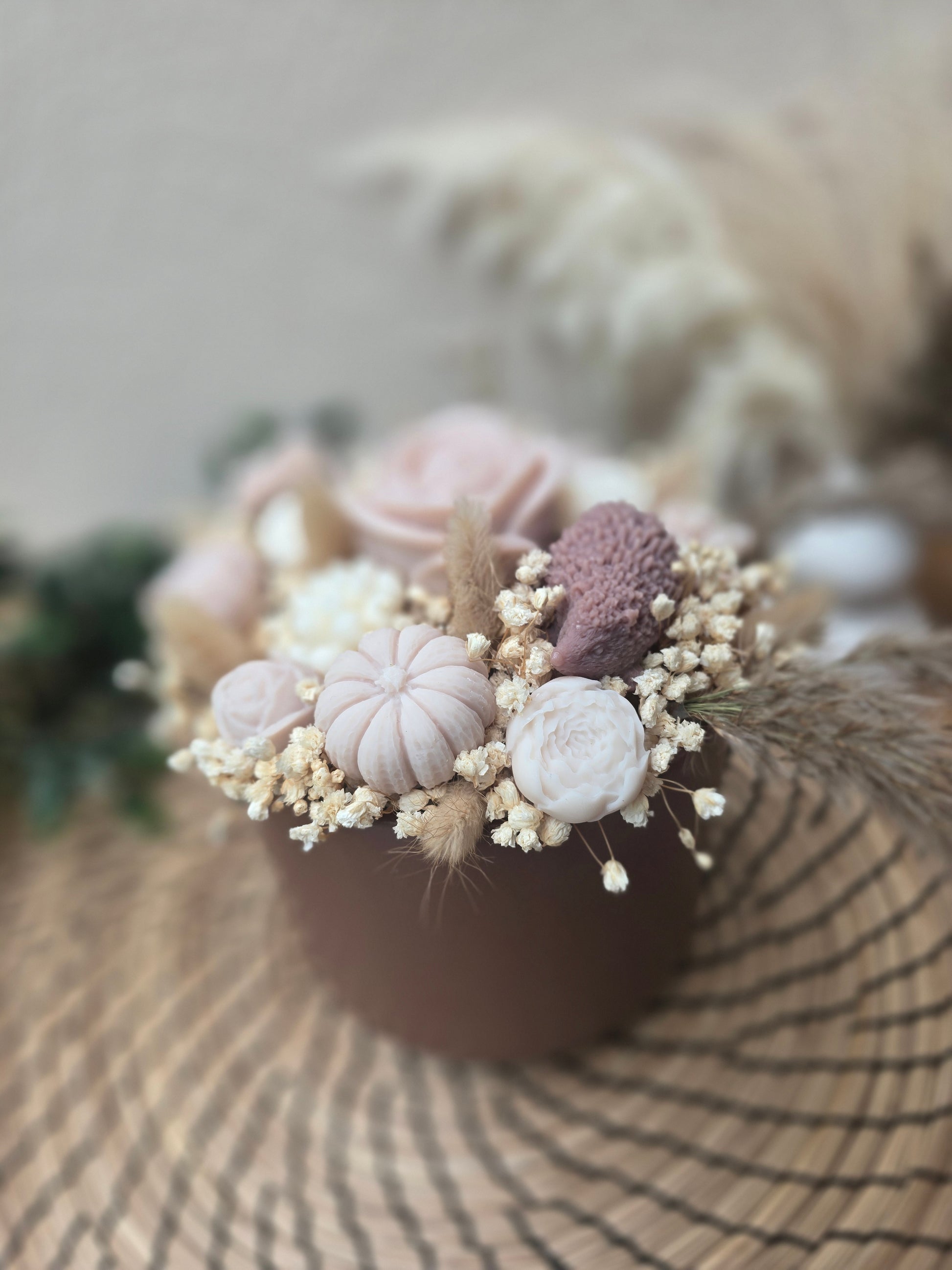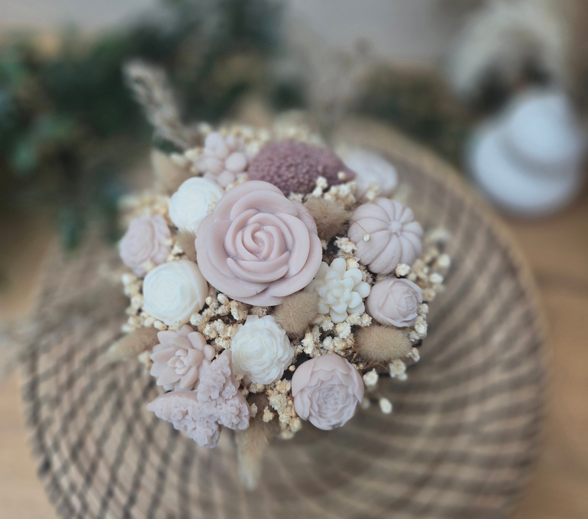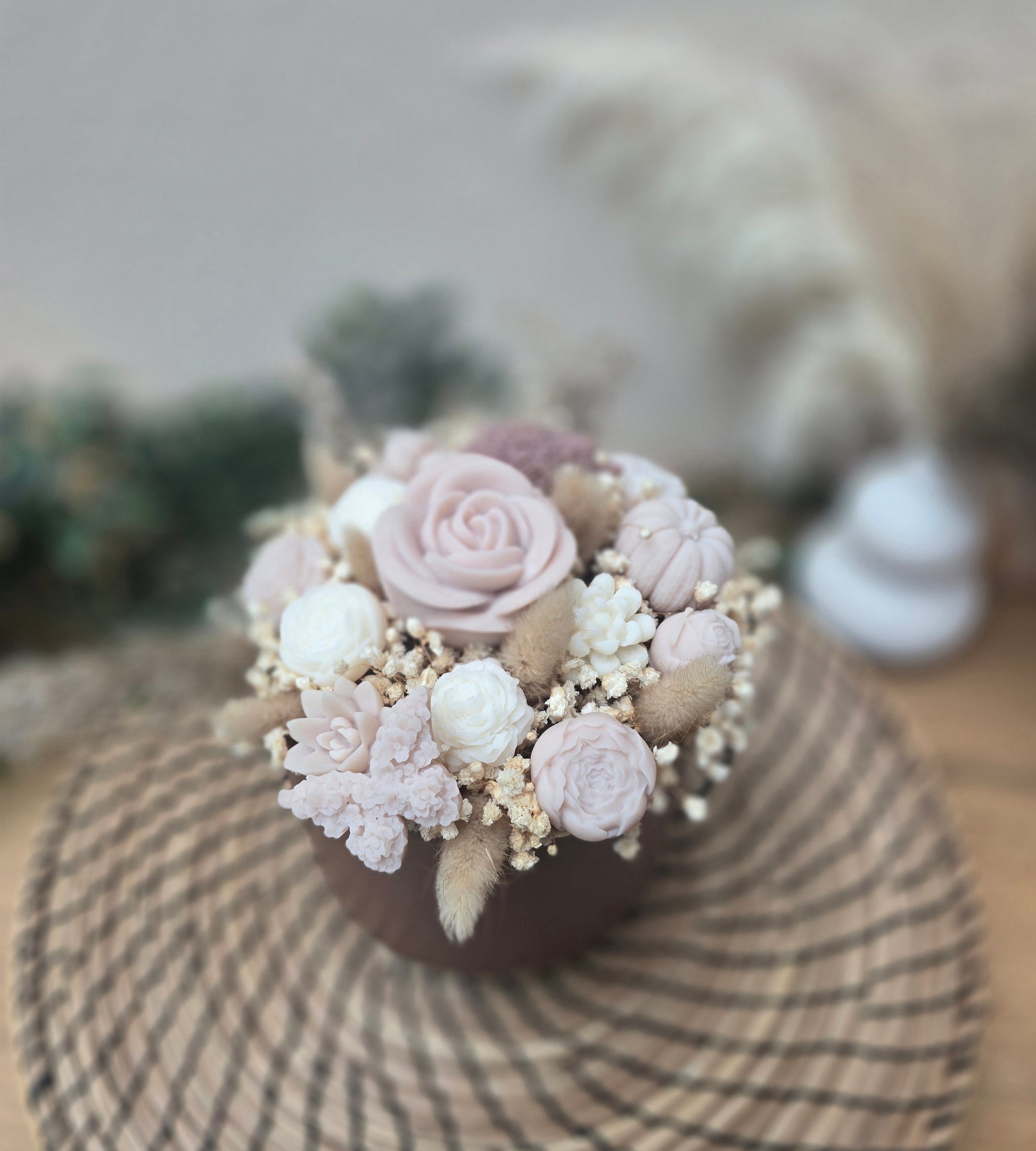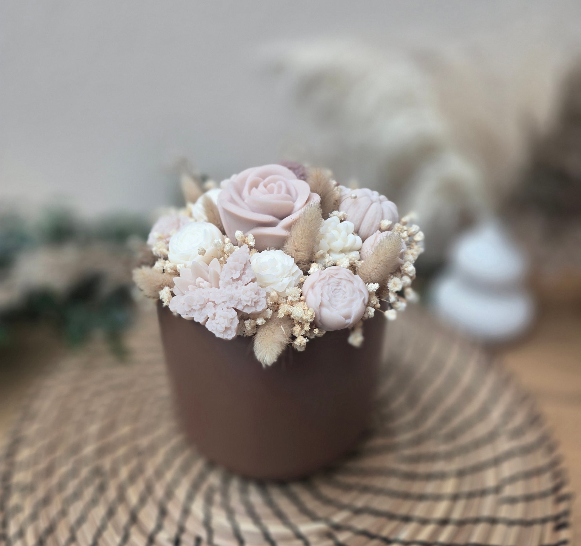 Ce bouquet d’automne artisanal marie des fleurs en cire et des fleurs séchées naturelles dans des tons de brun et crème. Il crée une ambiance cosy et raffinée qui ne fane pas.