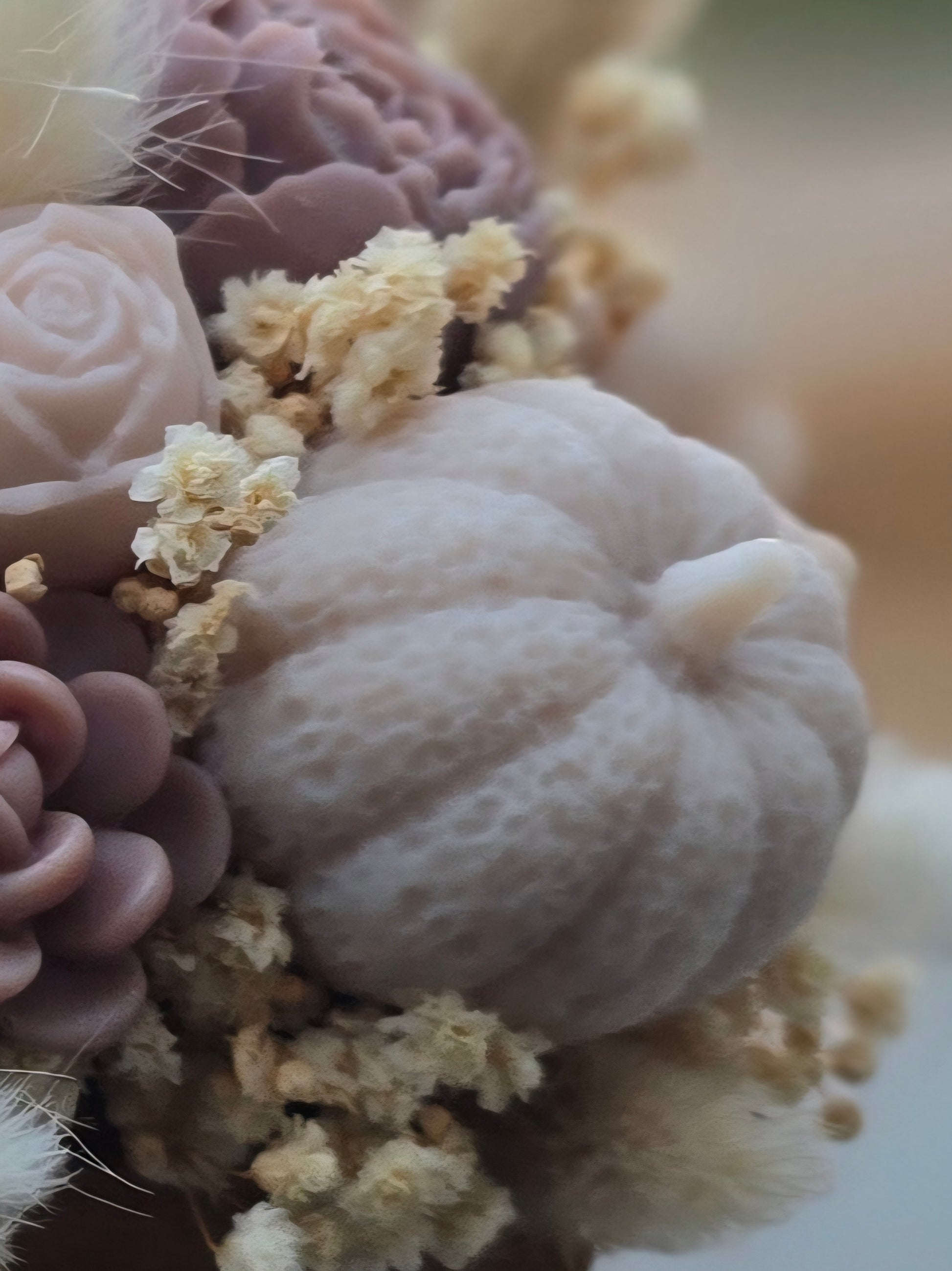 Ce bouquet d’automne artisanal mêle fleurs en cire et fleurs séchées naturelles dans des tons de rosé, mauve et crème. Les détails – roses, succulentes, petite citrouille et hérisson – composent une ambiance cosy et raffinée qui ne fane pas.